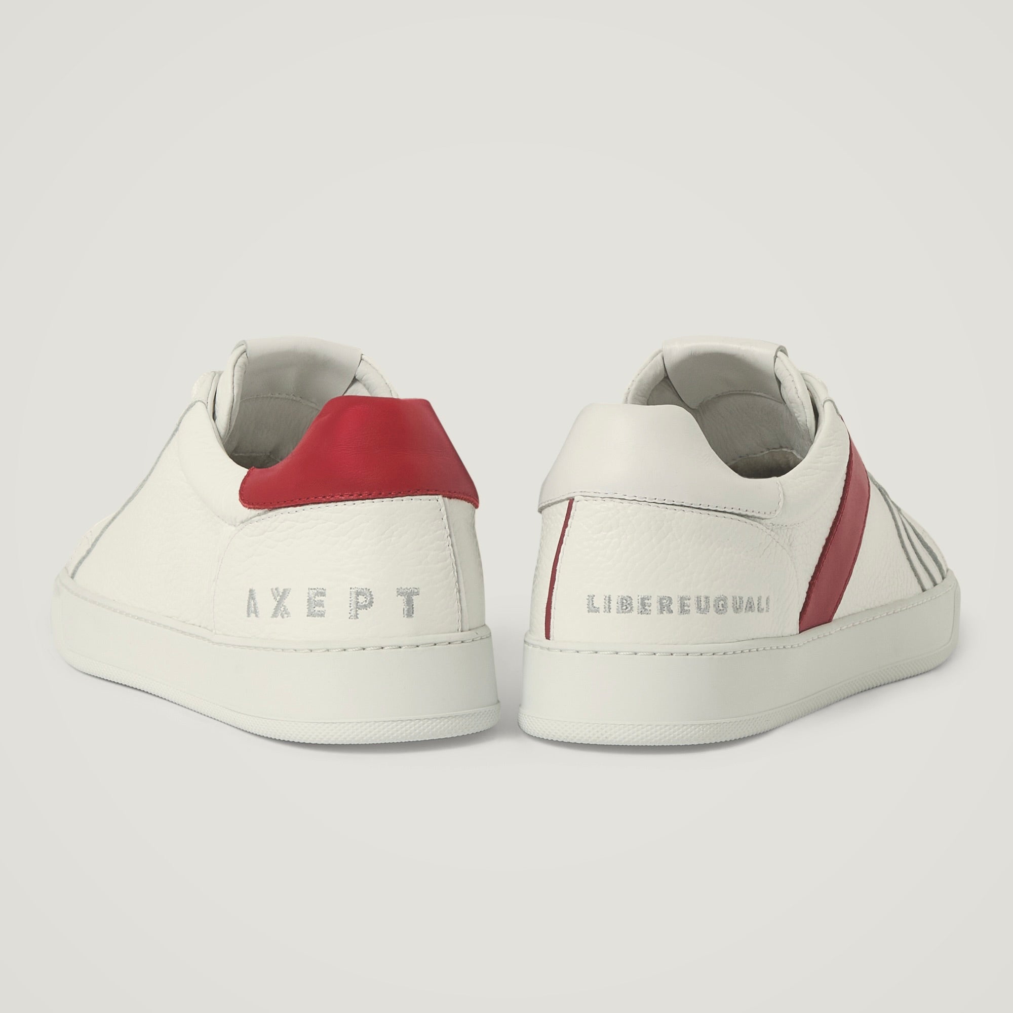 Scritta Axept ricamata sulla mezza luna asimmetrica a sinistra del tallone e scritta LibereUguali ricamata sulla mezza luna asimmetrica a sinistra del tallone.