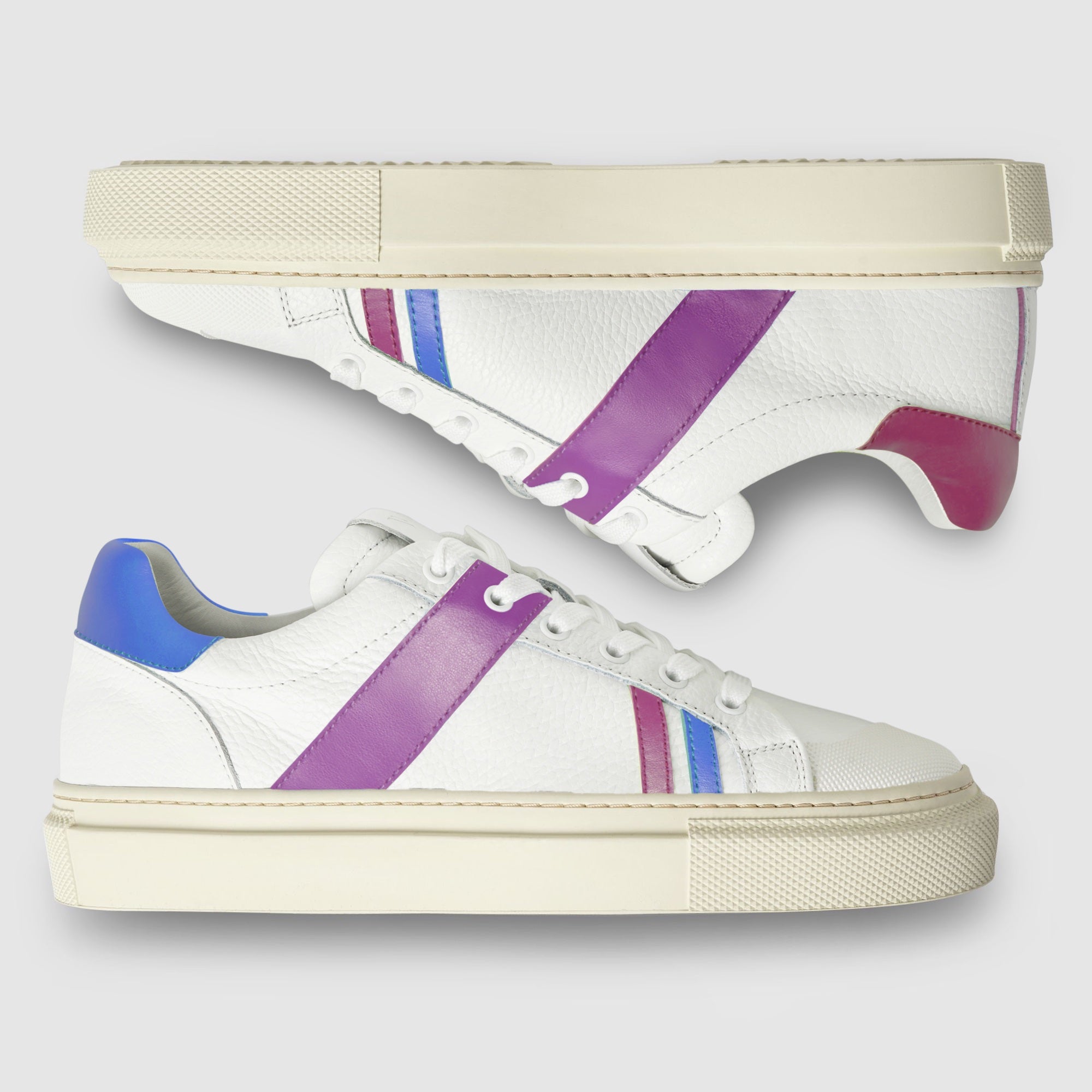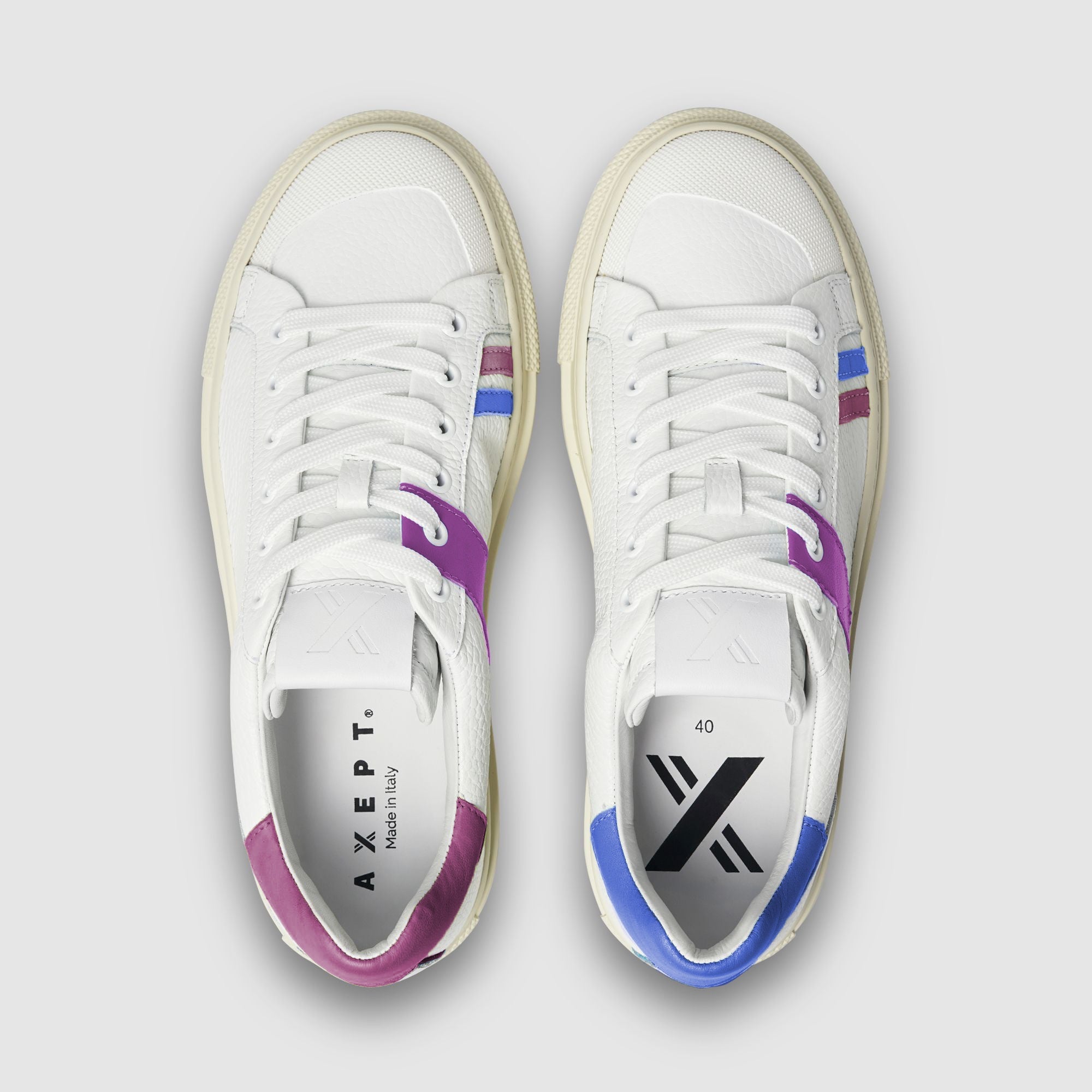 La sneaker Lilac Together combina una suola chunky con pelle italiana di prima qualità, una punta asimmetrica e la "X" di Axept che si forma dall'unione delle due scarpe, creando un look audace e iconico con uno stile straordinario.