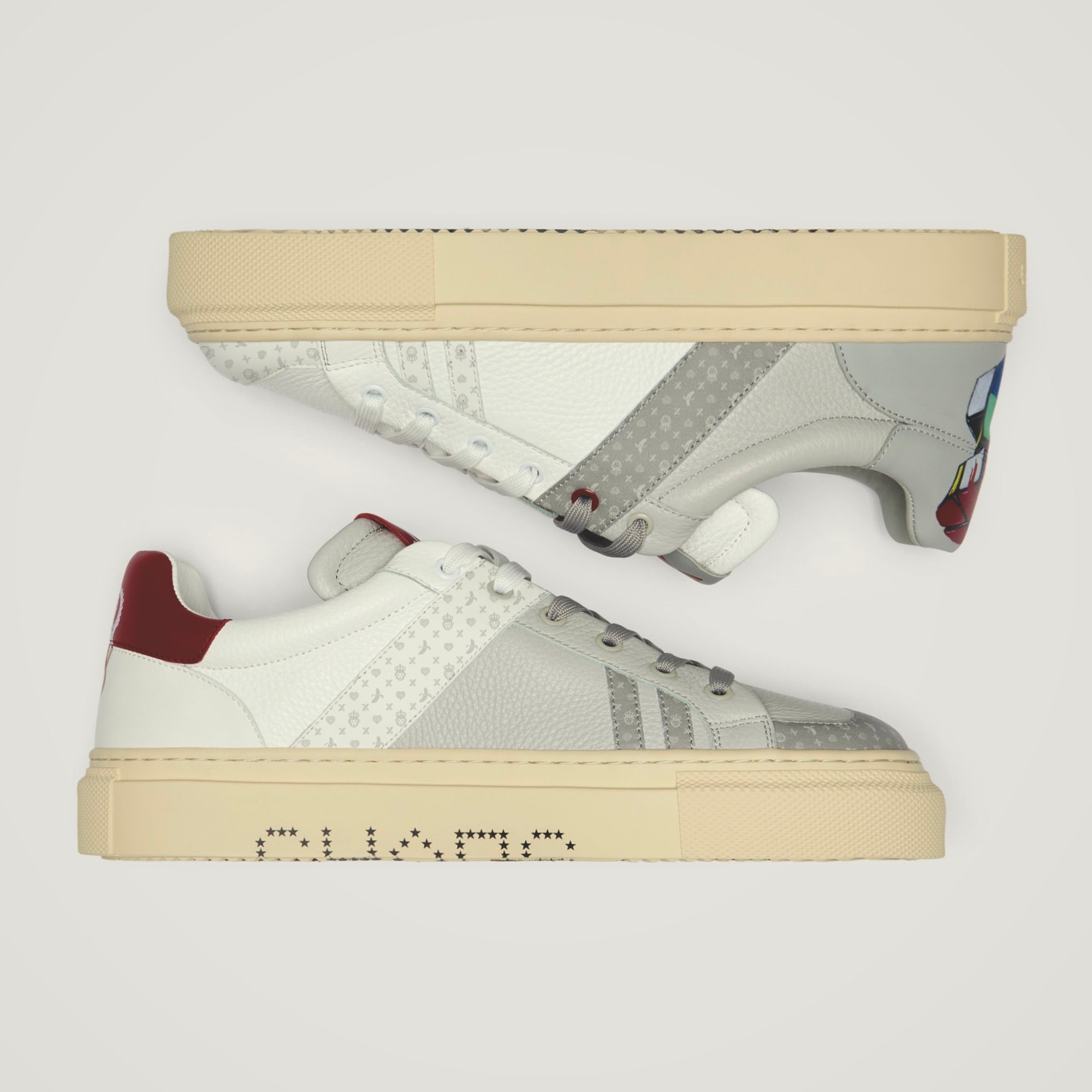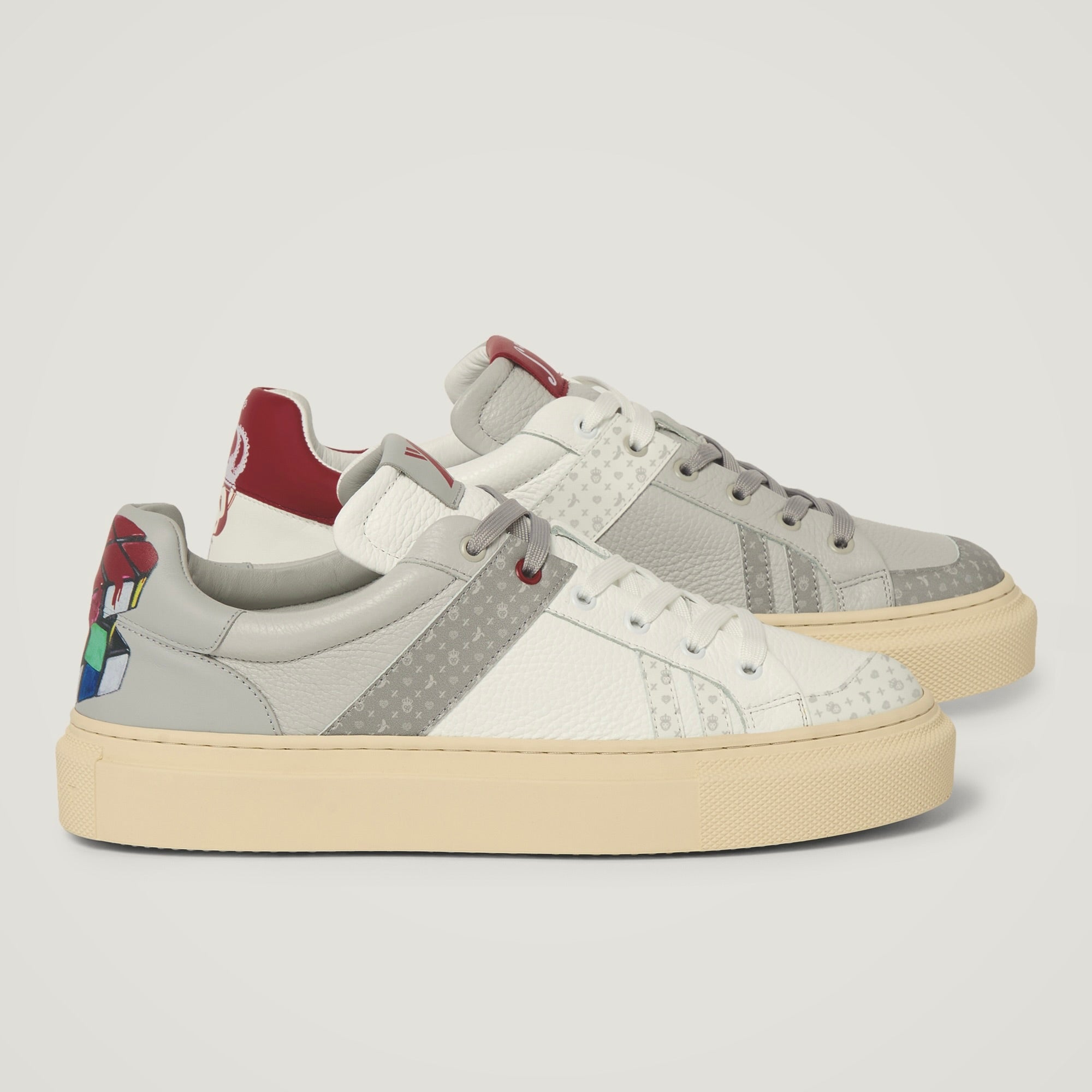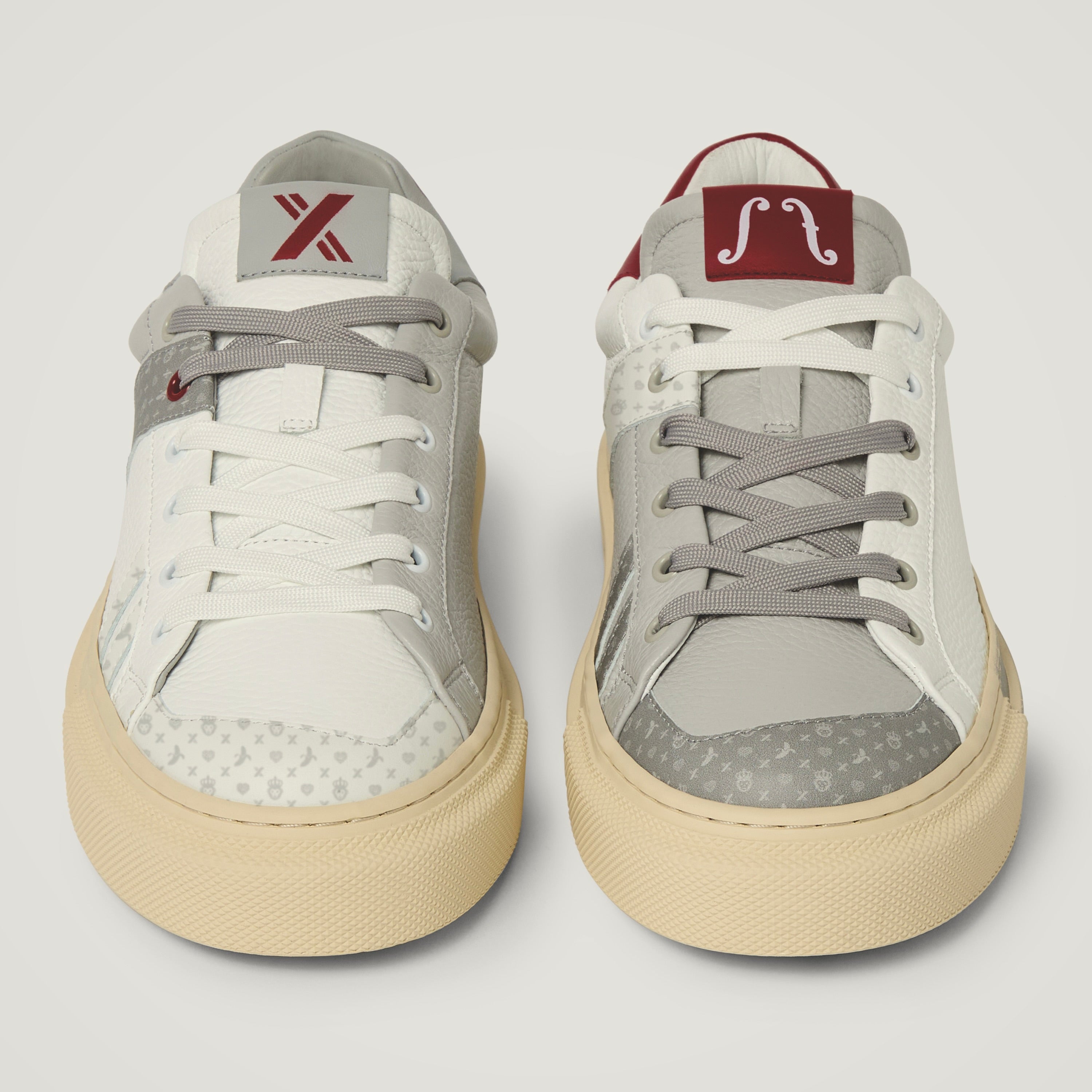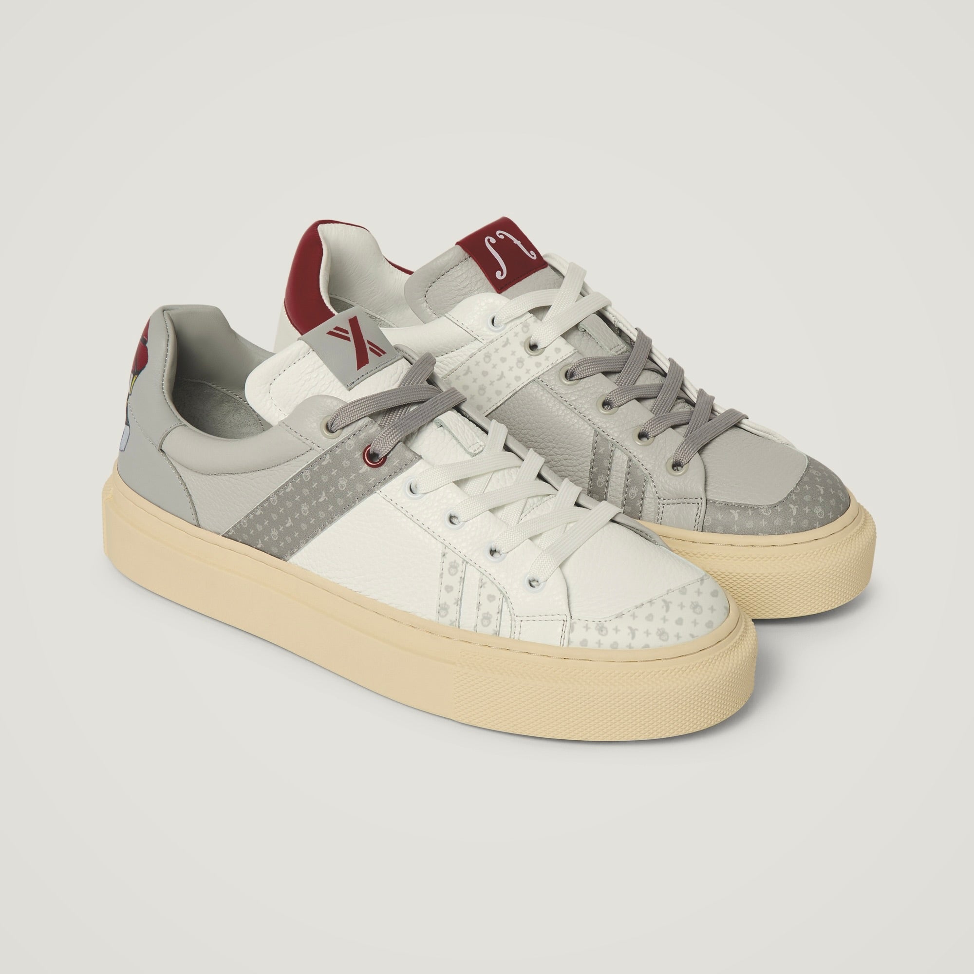 Color: the iconic side stripes, reinterpreted with an asymmetric twist, feature a tone-on-tone monogram pattern in grey and white that, upon closer look, reveals details from Simone Fugazzotto’s original artwork.