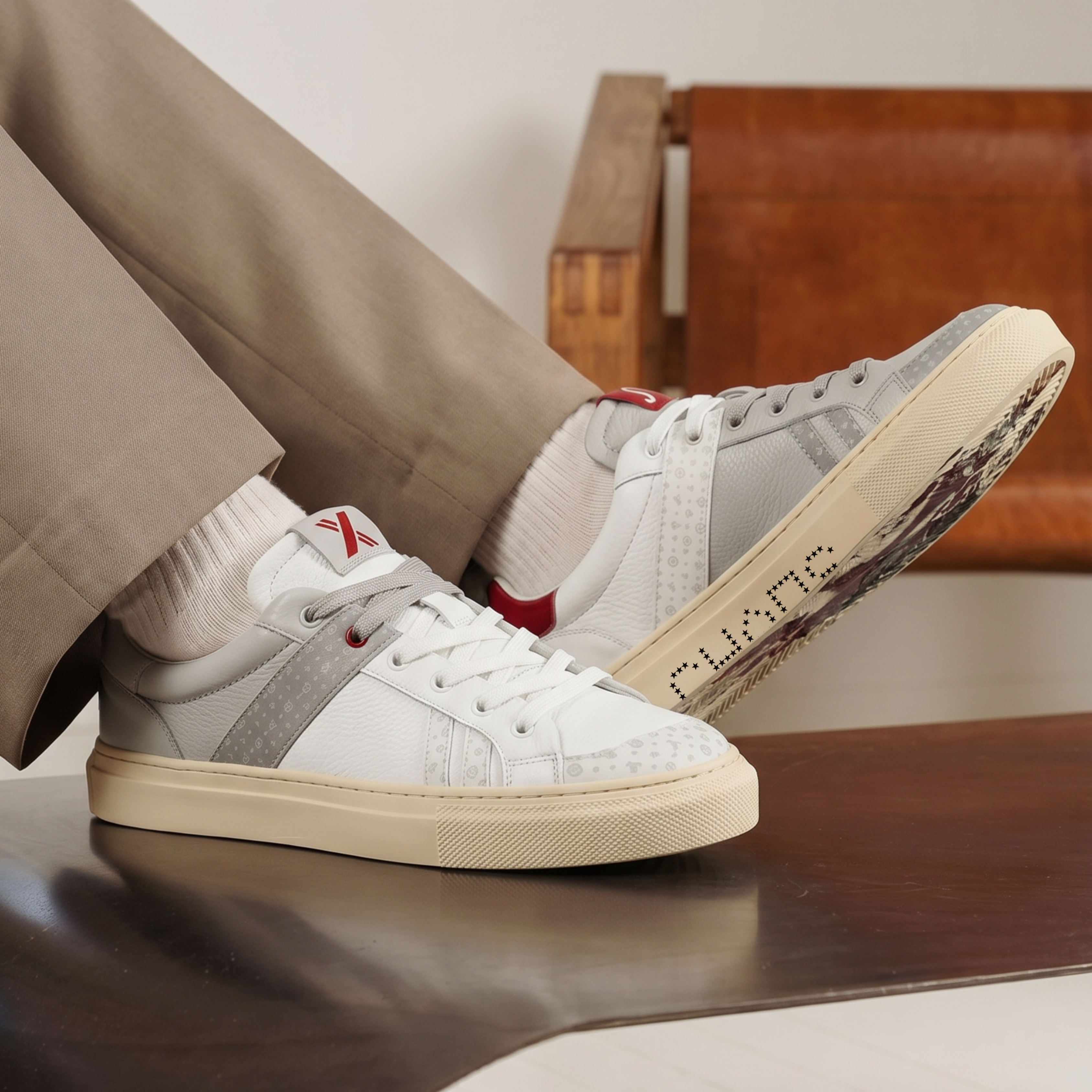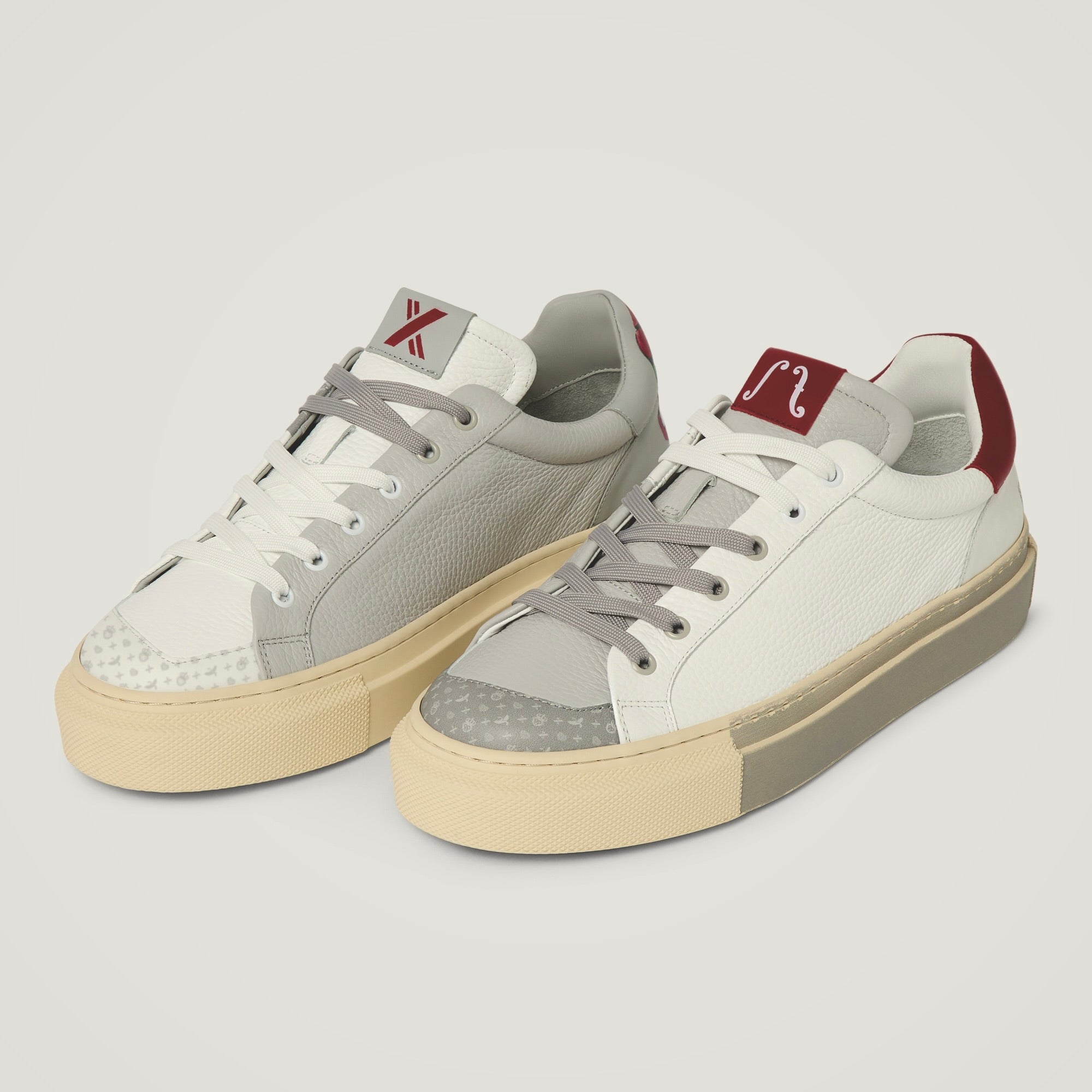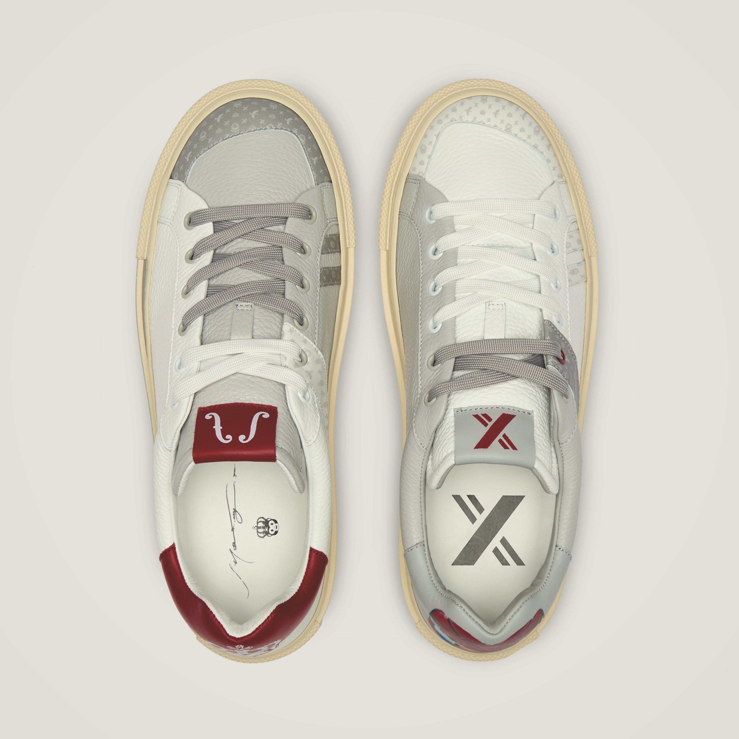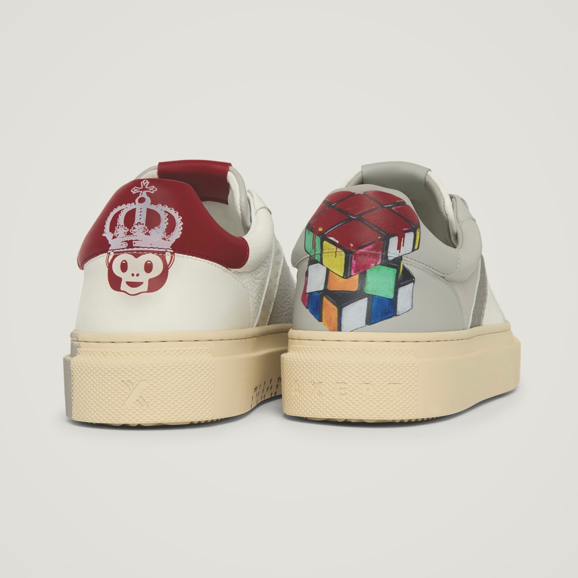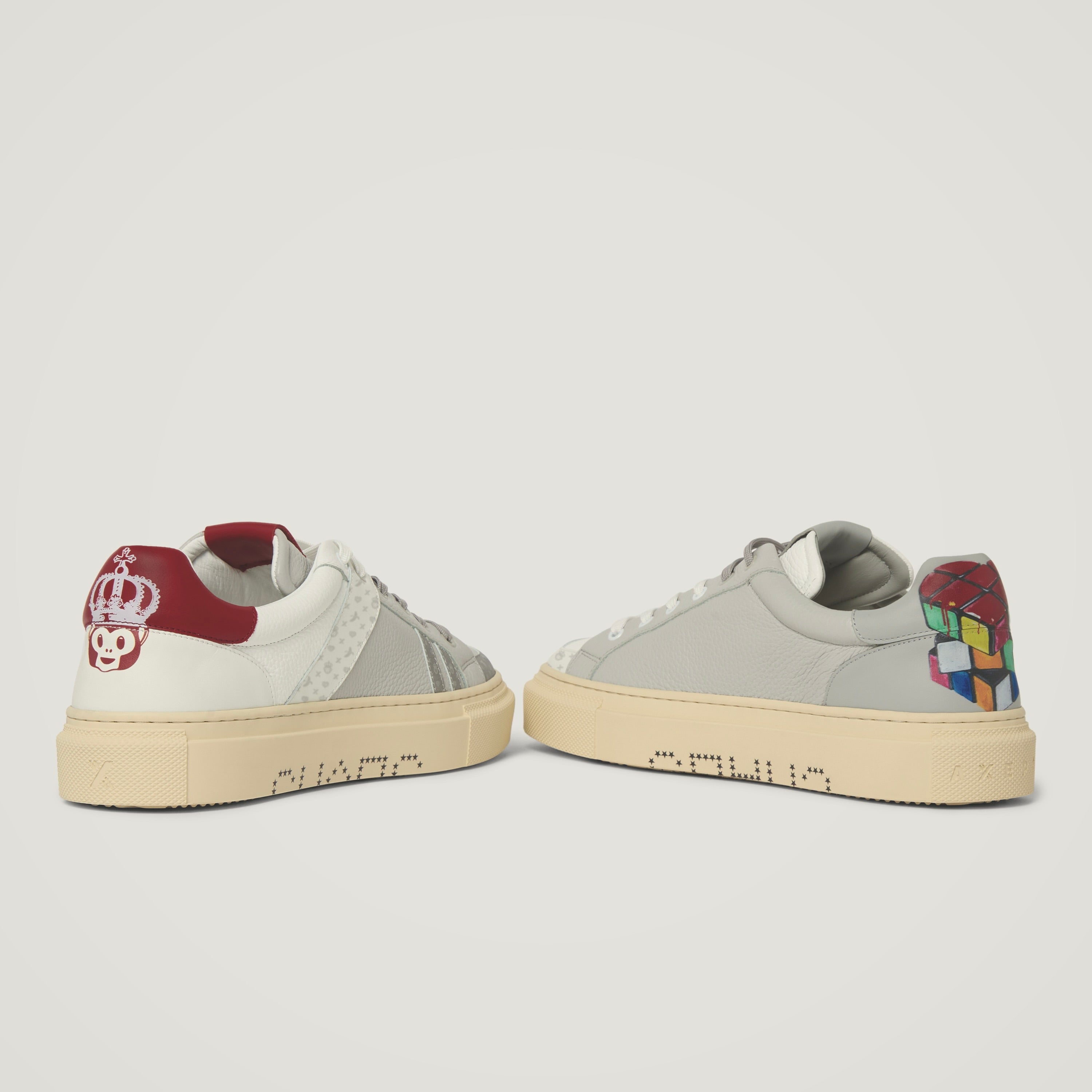 Color: the iconic side stripes, reinterpreted with an asymmetric twist, feature a tone-on-tone monogram pattern in grey and white that, upon closer look, reveals details from Simone Fugazzotto’s original artwork.