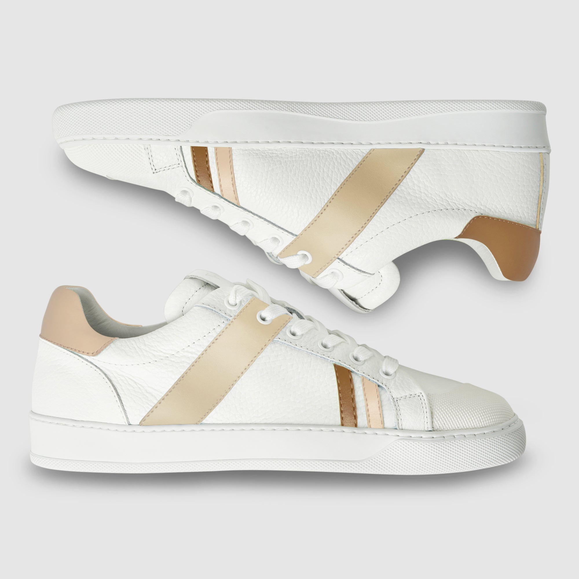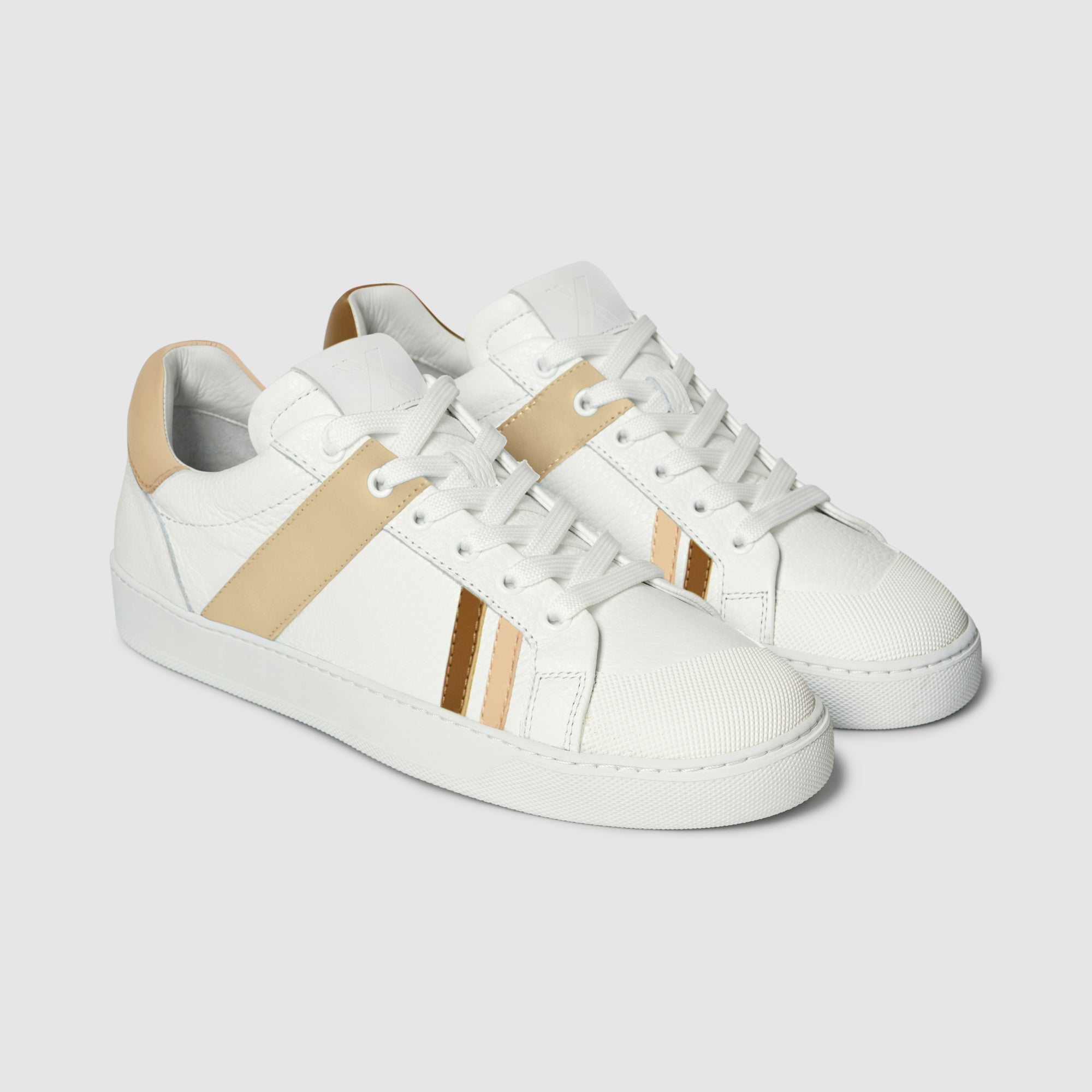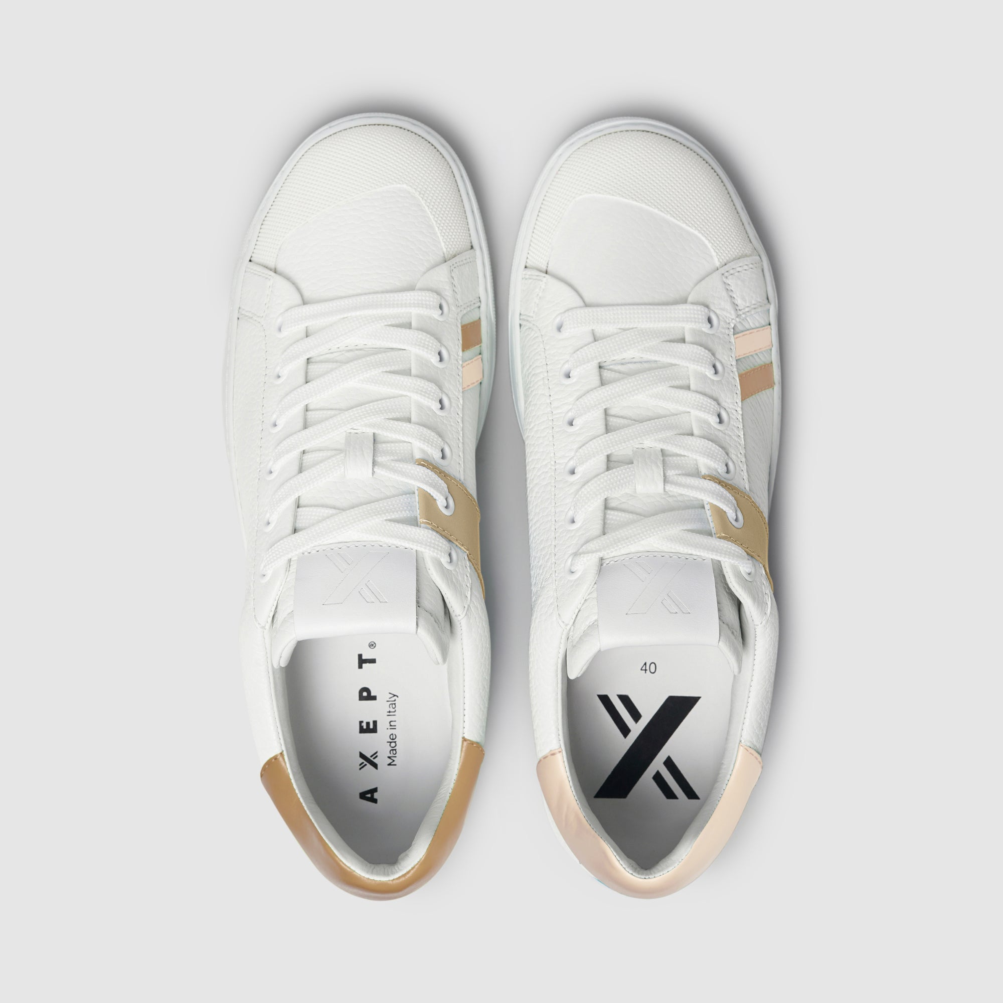 The Together sneaker combines minimalist design with our iconic mismatched style, bringing elegance and personality to every step. Handcrafted in Italy from premium grained leather, this sneaker features a flat sole that provides comfort and stability all day long. The distinctive asymmetrical textured rubber toe cap adds a contemporary flair, while the Axept logo, formed by uniting the two sneakers within the box, reflects the idea that two unique elements can come together to create something extraordinary. Our signature band covering the second eyelet stands out as a mark of originality and dynamism. Together is designed to be worn anytime, seamlessly complementing both casual and sophisticated looks.